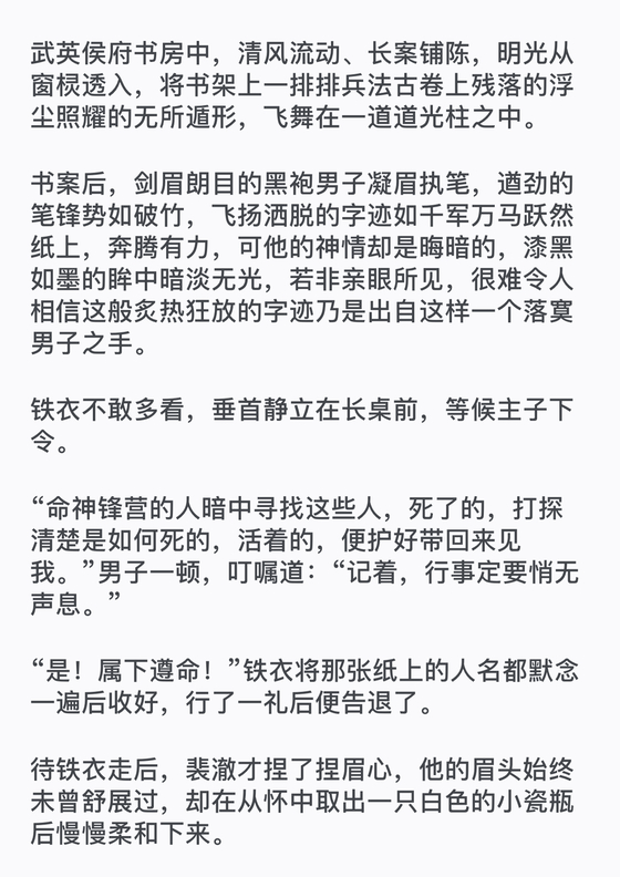 话音未落,小厮便被人拨到一边,书房的门紧跟着被“当啷”一声推开,裴澈在来人拐进内堂中前便将瓷瓶收进怀中,随手拿起一本兵书放在面前。