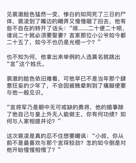 楚清有一次曾在裴澈面前称赞过言琛容貌卓绝,生在了许多女子的审美点上,且越是如他这般清冷孤傲的男子越是容易牵动少女们的心,所以京城才会有多如chao水的少女对他芳心暗许。