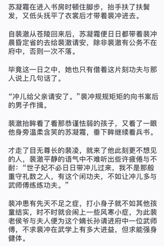 苏凝霜有些不甘的心想:若冲儿是楚清那贱人为他生下的孩子,他可还会这般冷漠无情?