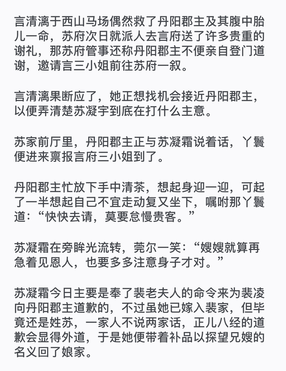 丹阳郡主虽心高气傲,但也不是拿心眼小到会与裴凌一个晚辈计较的人,且之前苏凝宇已对她多番抚wei,今日又见苏凝霜还算有诚意,故也未给她甩什么脸色。
