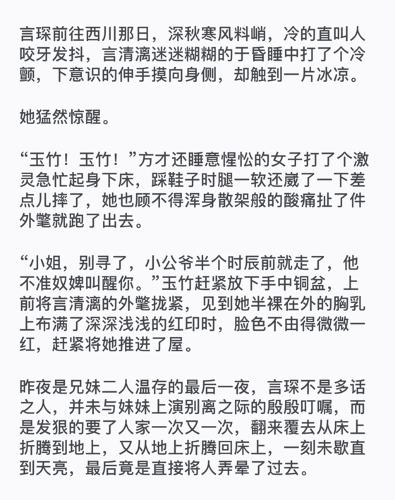 可就算此时情意绵绵,但再炙热nong1烈的感情也会随着日久天长的分隔两地而淡弱,言琛此去西川多则两年少则一年半载,为了令他将她深深印在心里想着念着,她说什麽也得去来一场不舍泪别。