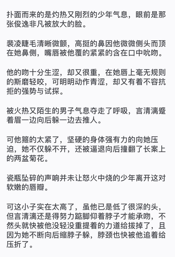 少女柔ruan微甜的she2划过他的chunban,在他微愣之际闯入他口中,轻巧拨弄,hua过他僵ying的she2与齿关,却舒适的如同三月温nuan的春风拂面,又如秋日缠绵清run的柔和细雨。